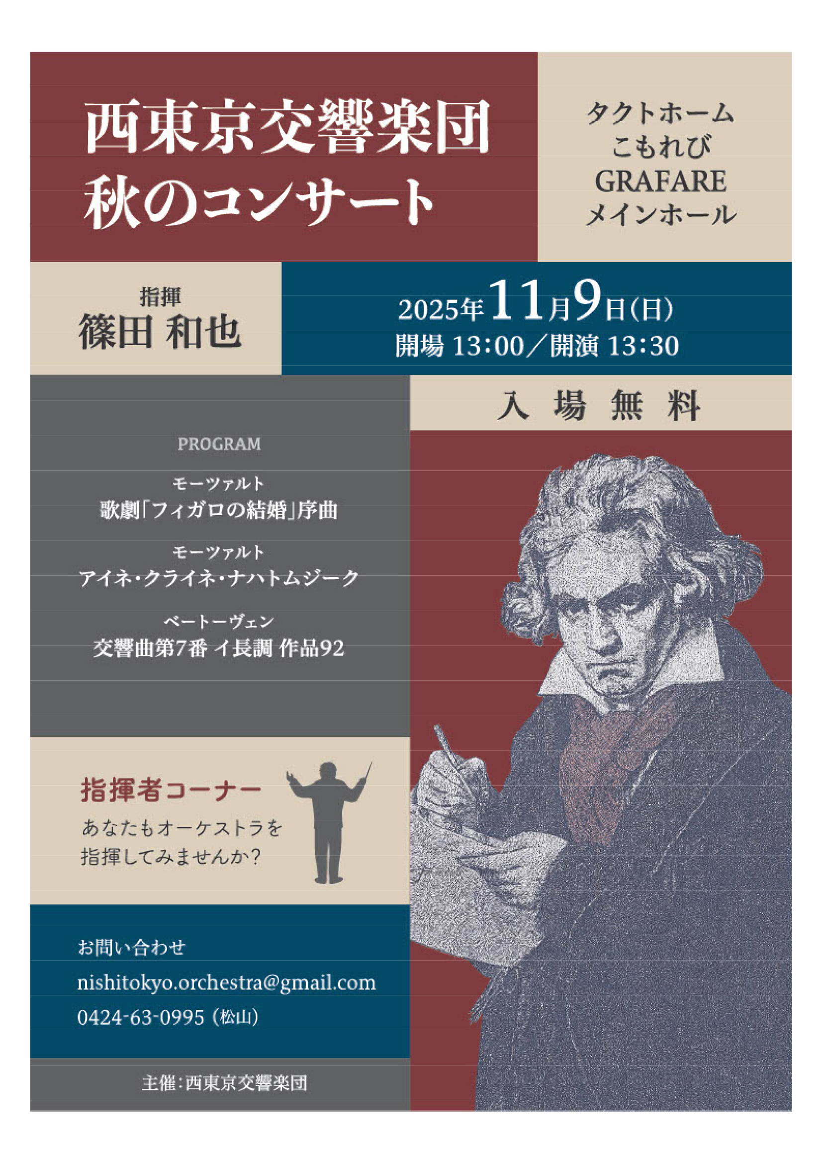 ⻄東京交響楽団 1994年5⽉に「⽥無市⺠オーケストラ」として発⾜。市⺠⽂化祭参加、 公⺠館や市役所の記念⾏事での演奏、「コール⽥無」のこけら落としなど、 地域に密着した活動を⾏ってきました。2001年1⽉に⽥無市と保⾕市が 合併して⻄東京市となったのを機に、名称を「⻄東京交響楽団」に変更。 近年は春と秋の2回の演奏会のほか、公共施設や商業施設などでのミニコンサートも⾏う。 2024年に創⽴30周年を迎えました。 *今回の演奏会では短い時間ではありますが指揮者体験コーナーを また手話を交えて皆さんとともに童謡を歌うなど 会場の皆様と交流感のある演奏会になればと考えております ご来場お待ちしております